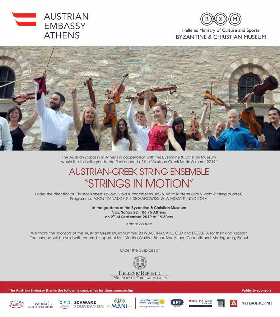 Το Βυζαντινό και Χριστιανικό Μουσείο και η Αυστριακή Πρεσβεία στην Αθήνα σας προσκαλούν στην καταληκτική συναυλία του «Ελληνοαυστριακού Μουσικού Καλοκαιριού 2019» / “Austrian Greek Music Summer 2019” με το αυστριακό ελληνικό μουσικό σύνολο εγχόρδων «STRINGS IN MOTION» υπό τη διεύθυνση του Χρήστου Κανέτη (βιολί, βιόλα & μουσική δωματίου) & της Anita Mitterer (βιολί, βιόλα, κουαρτέτο εγχόρδων) και πρόγραμμα των IASON TZANAKOS, P. I. TSCHAIKOWSKI, W. A. MOZART, NINO ROTA, στους κήπους του Βυζαντινού & Χριστιανικού Μουσείου (Β. Σοφίας 22, 106 75 Αθήνα) στις 2 Σεπτεμβρίου 2019 στις 19.30.