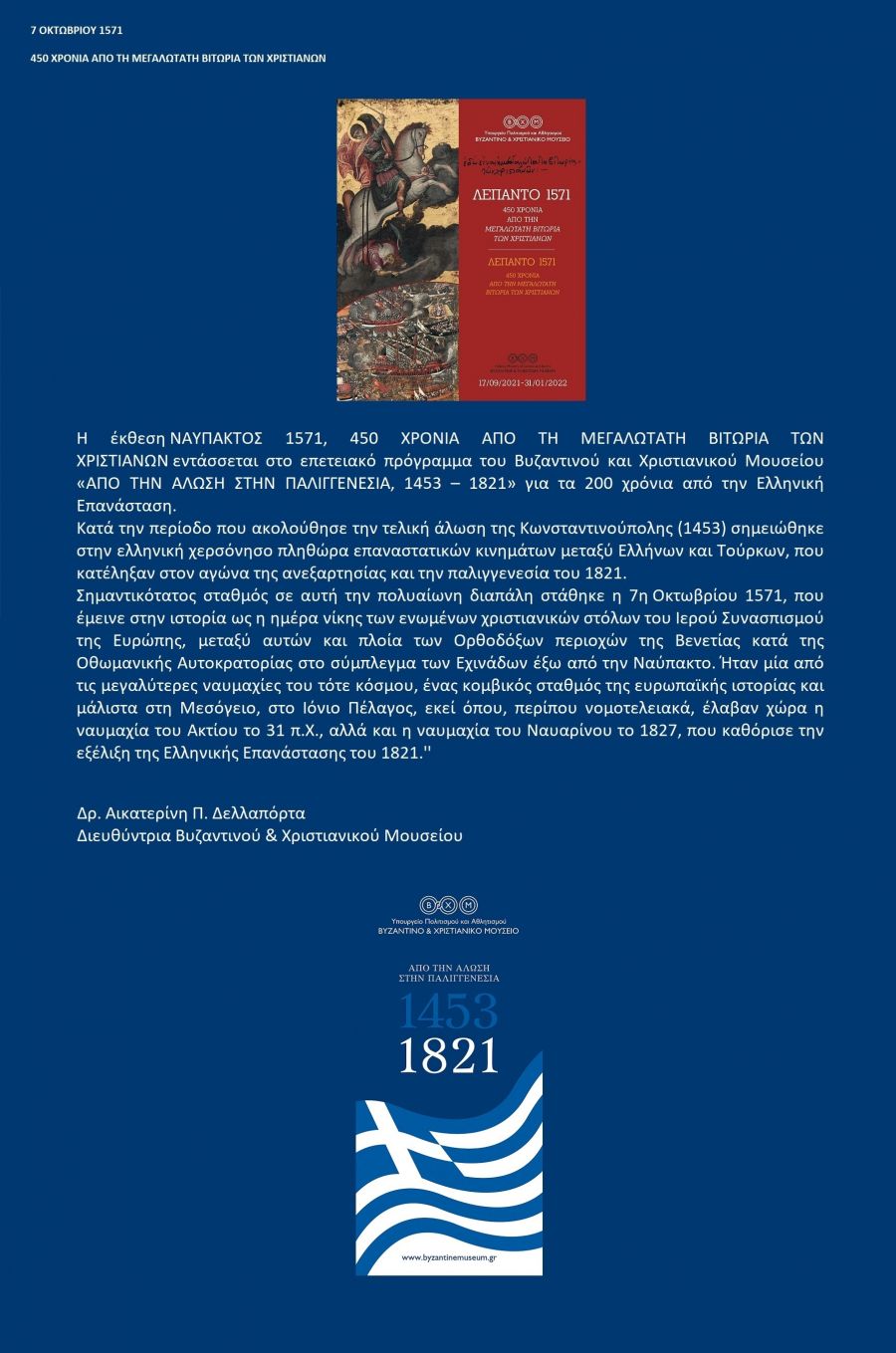 Η έκθεση ΝΑΥΠΑΚΤΟΣ 1571, 450 ΧΡΟΝΙΑ ΑΠΟ ΤΗ ΜΕΓΑΛΩΤΑΤΗ ΒΙΤΩΡΙΑ ΤΩΝ ΧΡΙΣΤΙΑΝΩΝ εντάσσεται στο επετειακό πρόγραμμα του Βυζαντινού και Χριστιανικού Μουσείου «ΑΠΟ ΤΗΝ ΑΛΩΣΗ ΣΤΗΝ ΠΑΛΙΓΓΕΝΕΣΙΑ, 1453 – 1821» για τα 200 χρόνια από την Ελληνική Επανάσταση.