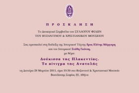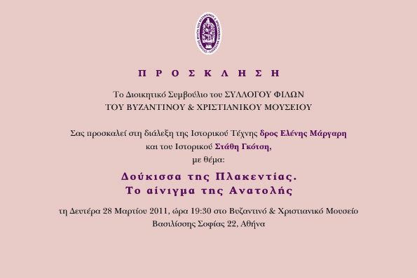 Τη Δευτέρα 28 Μαρτίου 2011, στις 19:30, θα πραγματοποιηθεί στο Βυζαντινό και Χριστιανικό Μουσείο διάλεξη της δρος Ελένης Μάργαρη, Ιστορικού Τέχνης και του Στάθη Γκότση, Ιστορικού με θέμα Δούκισσα της Πλακεντίας. Το αίνιγμα της Ανατολής.