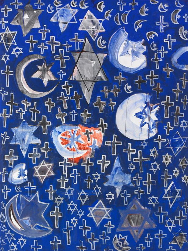 H Αποκαθήλωση, η Φιλοξενία του Αβραάμ, το μανδήλιο της Βερονίκης, η Φυγή στην Αίγυπτο, η εικόνα των Αγίων Κωνσταντίνου και Ελένης, ο Ιχθύς, η Παναγία της Ομορφιάς στα Λεύκαρα της Κύπρου, όλα τα χριστιανικά μοτίβα που δανείζεται ο καλλιτέχνης μεταλλάσσονται, και μετατρέπονται σε προσωπικές αφηγήσεις.