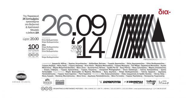 Η έκθεση ΔΙΑ παρουσιάζεται στο Βυζαντινό και Χριστιανικό Μουσείου από τις 26 Σεπτεμβρίου έως τις 29 Οκτωβρίου 2014. Σκοπός της έκθεσης είναι ο ζωντανός ΔΙΑ-ΛΟΓΟΣ μεταξύ εικαστικών – αρχιτεκτόνων – θεωρητικών και κοινού. Οι συμμετέχοντες δια-λέγονται με τους χώρους του Μουσείου. Κάθε λέξη με την πρόθεση δια βρίσκει την χωρική και εικαστική της έκφραση.