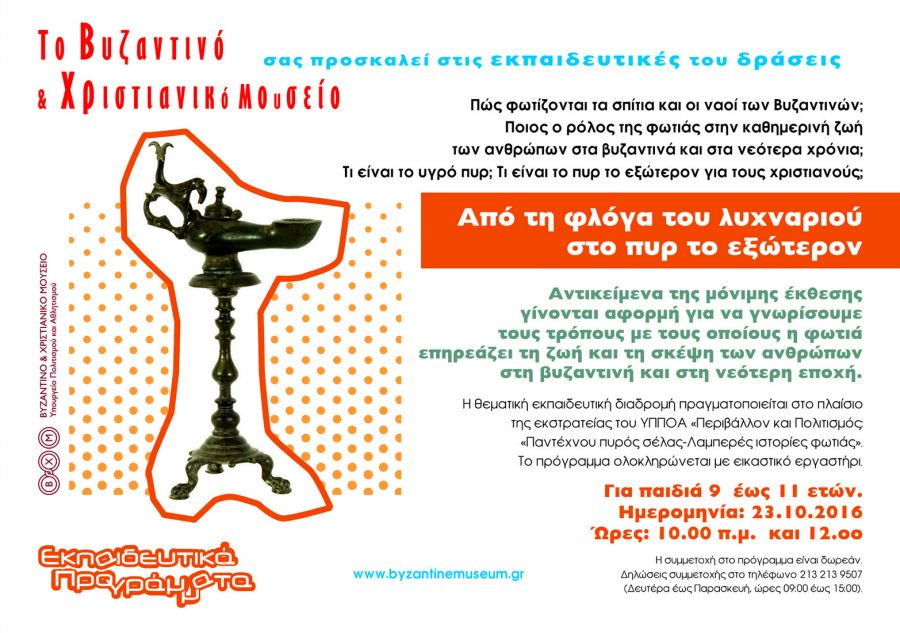 Λυχνάρια και μαγειρικά σκεύη, κεραμικά και αντικείμενα μεταλλοτεχνίας, εικόνες και άλλα επιλεγμένα αντικείμενα από την μόνιμη έκθεση του Βυζαντινού Μουσείου γίνονται η αφορμή για το εκπαιδευτικό πρόγραμμα «Από τη φλόγα του λυχναριού στο πυρ το εξώτερον», ώστε να συζητήσουμε και να απαντήσουμε σε ερωτήματα όπως τα παραπάνω. Το πρόγραμμα πραγματοποιείται με αφορμή την δράση «Περιβάλλον και Πολιτισμός 2016» που οργανώνει η Γενική Διεύθυνση Αρχαιοτήτων και Πολιτιστικής Κληρονομιάς του Υπουργείου Πολιτισμού και Αθλητισμού.
