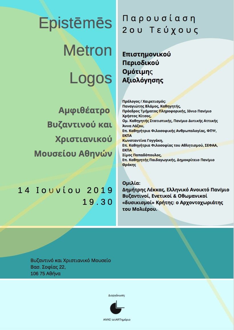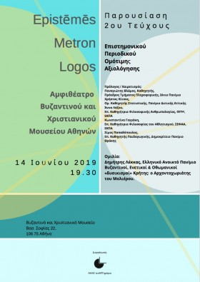 Την Παρασκευή 14 Ιουνίου 2019 και ώρα 19:30, στο αμφιθέατρο του Βυζαντινού και Χριστιανικού Μουσείου Αθηνών, παρουσιάζεται το δεύτερο τεύχος του Επιστημονικού Περιοδικού Ομότιμης Αξιολόγησης ‘’Epistēmēs Metron Logos’’.