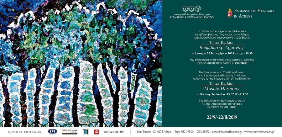 Το Βυζαντινό και Χριστιανικό Μουσείο εγκαινιάζει την έκθεση σύγχρονων ψηφιδωτών της Timea Karkiss με τίτλο “Ψηφιδωτές αρμονίες”, την Δευτέρα 23 Σεπτεμβρίου και ώρα 19:30 και θα διαρκέσει έως τις 22 Νοεμβρίου 2019.