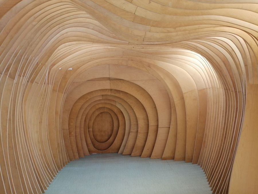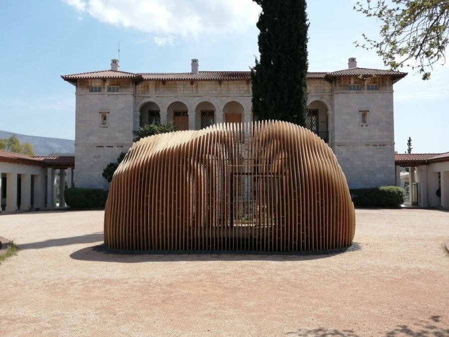 Το «Κουκούλι, 2020», είναι ένα περίπτερο, διαστάσεων 6,55μ. Χ 4,80μ. Χ 3,30μ (ύψος), από φύλλα κόντρα πλακέ σημύδας, το οποίο κατασκευάστηκε ως αίθουσα τσαγιού «Οριμπέ» (από το όνομα του ειδήμονα τσαγιού Φουρούτα Οριμπέ, 1543-1615) όπως αυτές που ο διαπρεπής αρχιτέκτονας Κένγκο Κούμα δημιουργεί παράλληλα με το σχεδιασμό των μεγάλων έργων του. Η εκτέλεση του έργου πραγματοποιήθηκε με τη συνεργασία του αρχιτεκτονικού γραφείου «Kengo Kuma & Associates» (Τόκιο – Παρίσι) και της ομάδας του Επίκουρου Καθηγητή στη Σχολή Αρχιτεκτόνων Μηχανικών του Εθνικού Μετσόβιου Πολυτεχνείου κ. Παναγιώτη Βασιλάτου. Η δομή του αρχιτεκτονήματος αποτελείται από 72 κάθετα πάνελ κόντρα πλακέ σημύδας, πάχους 1,5 εκ. το καθένα, τοποθετημένα σε απόσταση 7,5 εκ. μεταξύ τους ώστε να δημιουργούν εξωτερικά και εσωτερικά ένα μεταβαλλόμενο (στο φως και στις διάφορες οπτικές γωνίες) ένα οργανικό σχήμα που να προσομοιάζει αφενός στην ανομοιογένεια του τύπου της κούπας τσαγιού που άρεσε στον Φουρούτα Οριμπέ και αφετέρου σε κουκούλι και μήτρα. Χαρακτηριστικό γνώρισμα των αρχιτεκτονικών κατασκευών του Κούμα είναι η ιδιαίτερη ανάδειξη λεπτομερειών που συνθέτουν το σύνολο των επιφανειών. Το ιδιόμορφο αυτό έργο, κλειστό και ανοικτό ταυτόχρονα στον περιβάλλοντα χώρο, αναπνέει μαζί με τους ενοίκους του και προσομοιάζει στα διάφορα κουκούλια των εντόμων, από ξυλοπολτό, χώμα, μετάξι ή φύλλα, τα οποία λειτουργούν σαν χρονοκάψουλες μετασχηματισμού της κάμπιας σε πεταλούδα.